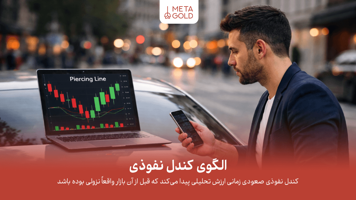 الگوی کندل نفوذی که با نامهای کندل پیرسینگ و الگوی Piercing Line هم شناخته میشود، یکی از الگوهای دو کندلیِ بازگشتی است که معمولاً بعد از یک حرکت نزولی دیده میشود و میتواند نشانهای از کاهش قدرت فروشندگان و افزایش احتمال برگشت قیمت باشد. اگر بخواهیم خیلی دقیق بگوییم کندل نفوذی چیست، پاسخ این است: ابتدا یک کندل نزولی شکل میگیرد، سپس کندل بعدی صعودی میشود و بخش قابلتوجهی از بدنه کندل نزولی قبلی را پس میگیرد؛ همین “نفوذ” در بدنه کندل اول، پیام اصلی الگو را منتقل میکند.