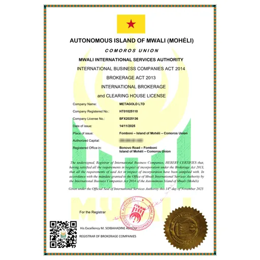 MetaGold LTD، یک شرکت تحت نظارت است که به طور رسمی در اتحادیه کومور (موالی) ثبت شده و تمام الزامات قانونی برای تأسیس و ادامه فعالیت تحت قانون شرکتهای تجاری بینالمللی را با شماره ثبت HT01025110 رعایت کرده است و دارای مجوز معتبر کارگزاری شماره BFX2025136 صادر شده توسط M.I.S.A میباشد.